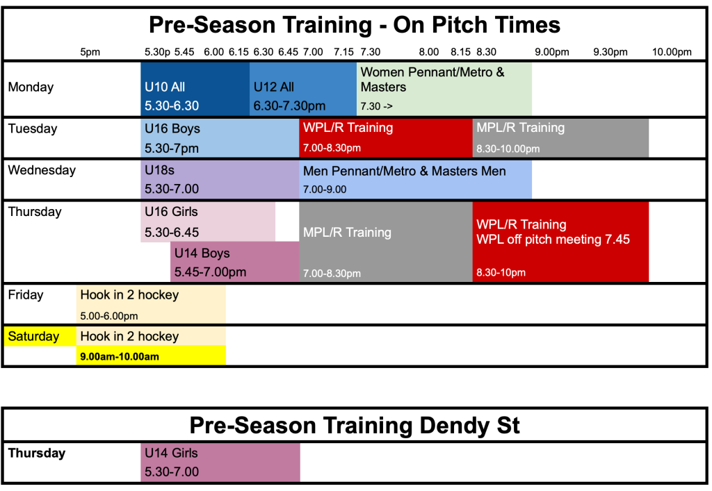 Preseason training starts on Tuesday 27th January on pitch from 8.30 pm and on Thursdays on pitch from 7.00 pm .  These training sessions are open to the whole section for the first few weeks with players aspiring to play PL or PLR encouraged to come along.